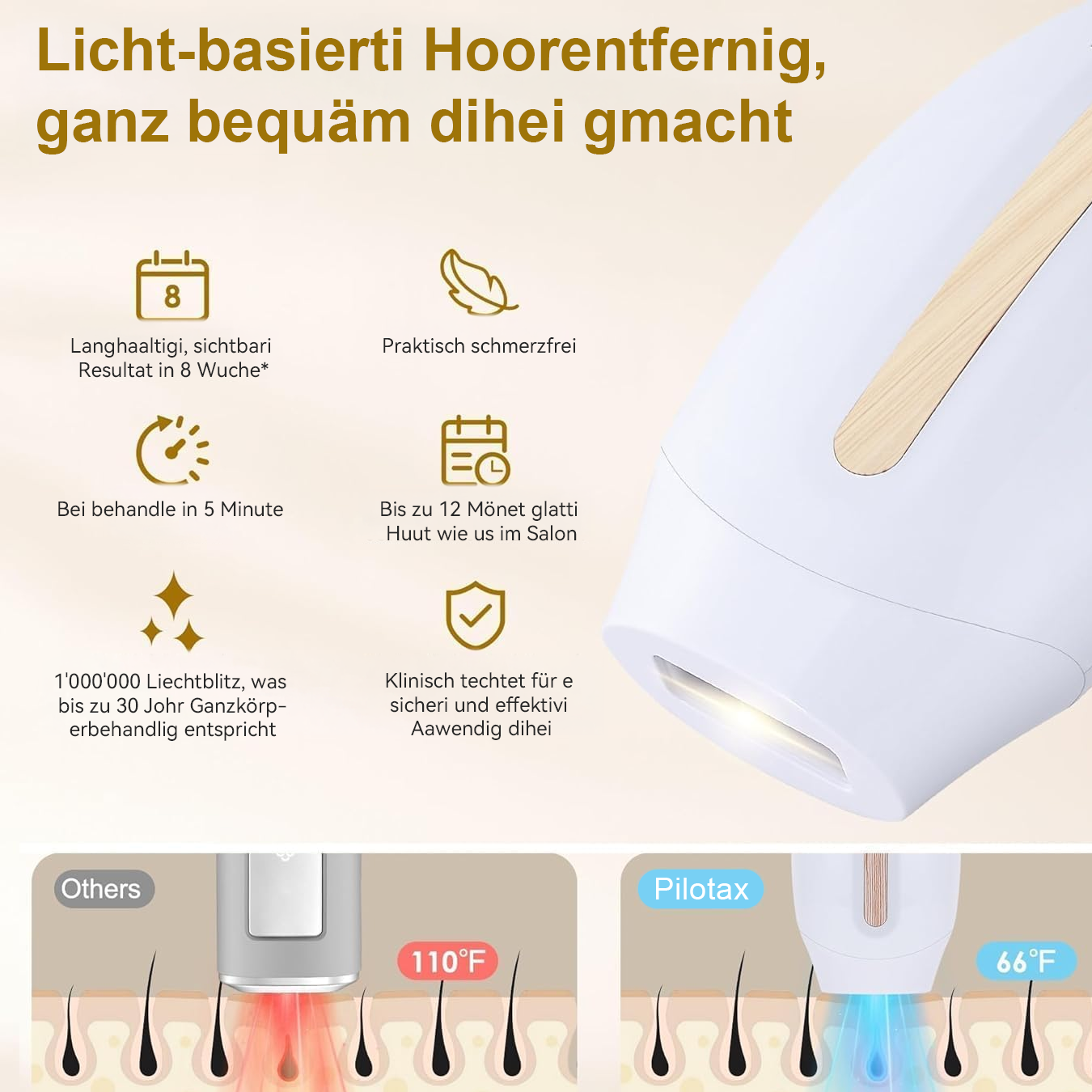 - Schmerzfreie Haarentfernung – Sanfte Lichtimpulse minimieren Unbehagen und machen den Prozess angenehm.